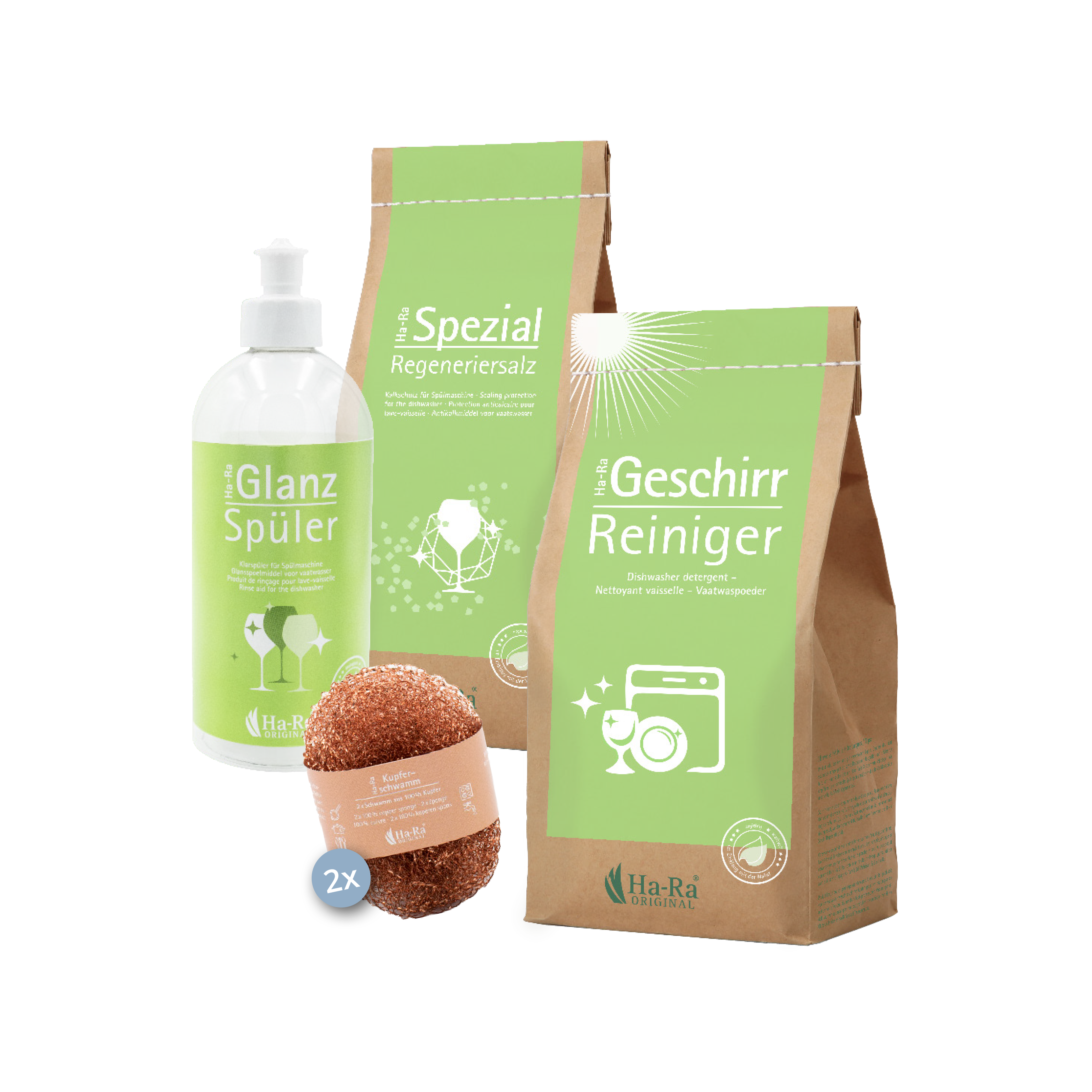 pré-traiter la vaisselle. Notre set Produit de lavage plus contient une éponge en cuivre pour enlever sans problème les incrustations tenaces.